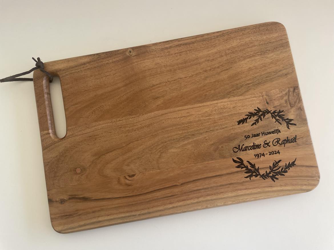 Een unieke en persoonlijke creatie op een prachtige snijplank of serveerplank, met liefde vervaardigd uit hoogwaardig acaciahout. Een schitterend cadeau voor elke gelegenheid. Door het toevoegen van een persoonlijke touch wordt het een absoluut uniek stuk. Het bord is compact van formaat en veelzijdig in gebruik.